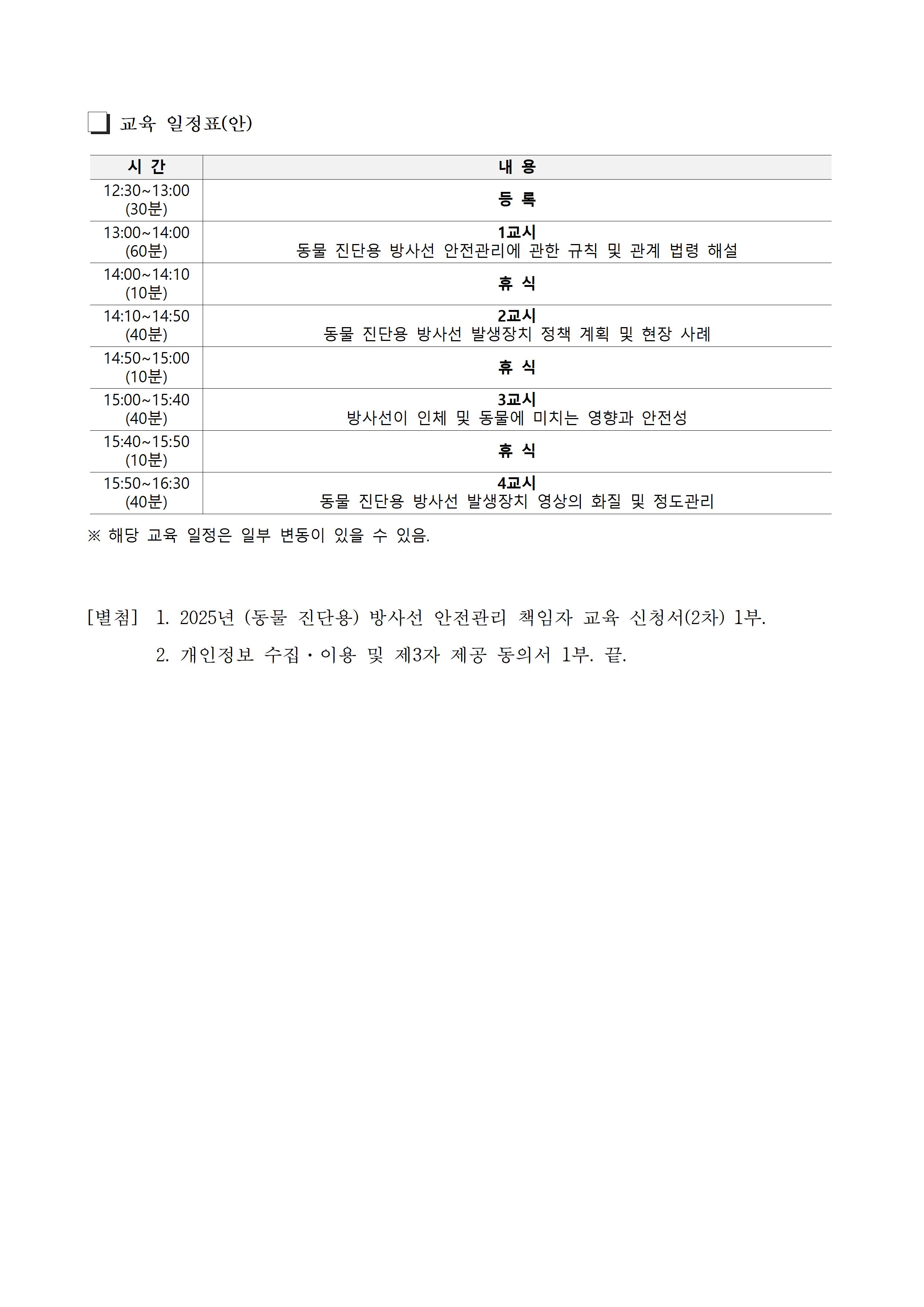 [안내] 2025년도 (동물 진단용) 방사선 안전관리 책임자 교육(2차/12.5.) 안내