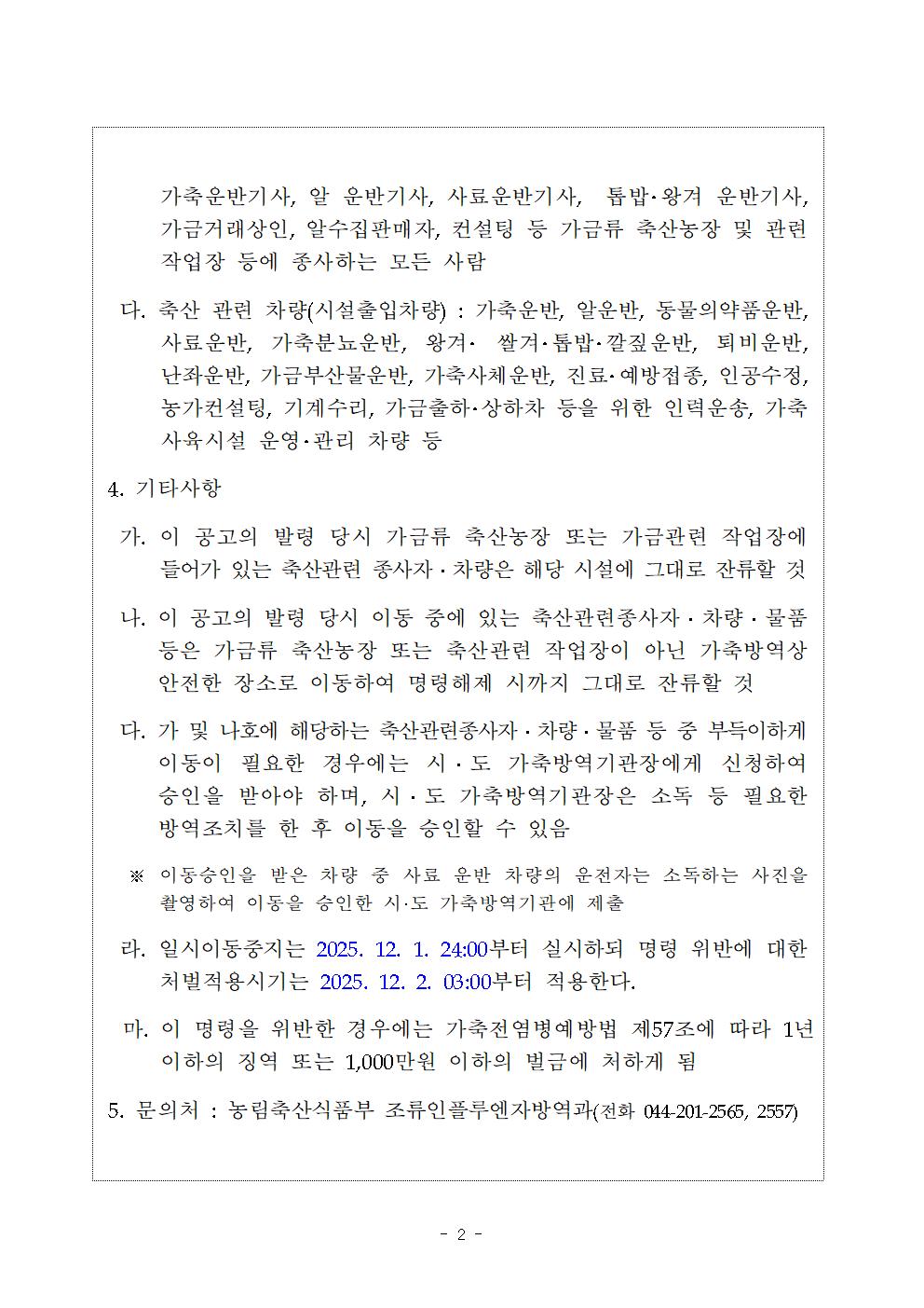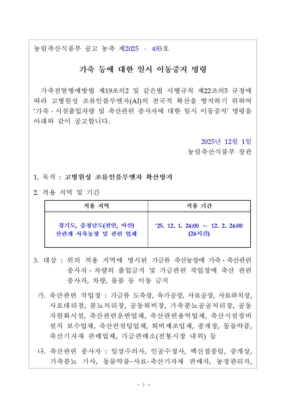 가축(산란계) 등의 일시이동중지명령(경기 및 충남, '25.12.1.24:00~12.2.24:00)