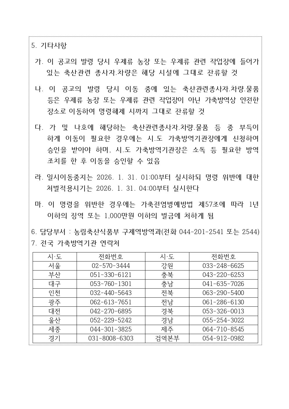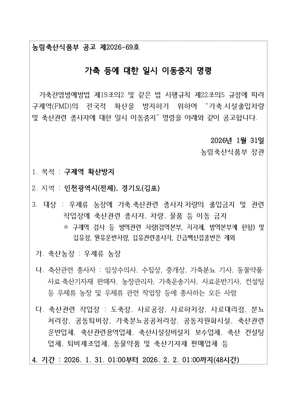 가축(우제류) 등의 일시이동중지명령('26.1.31.01:00~2.2.01:00)