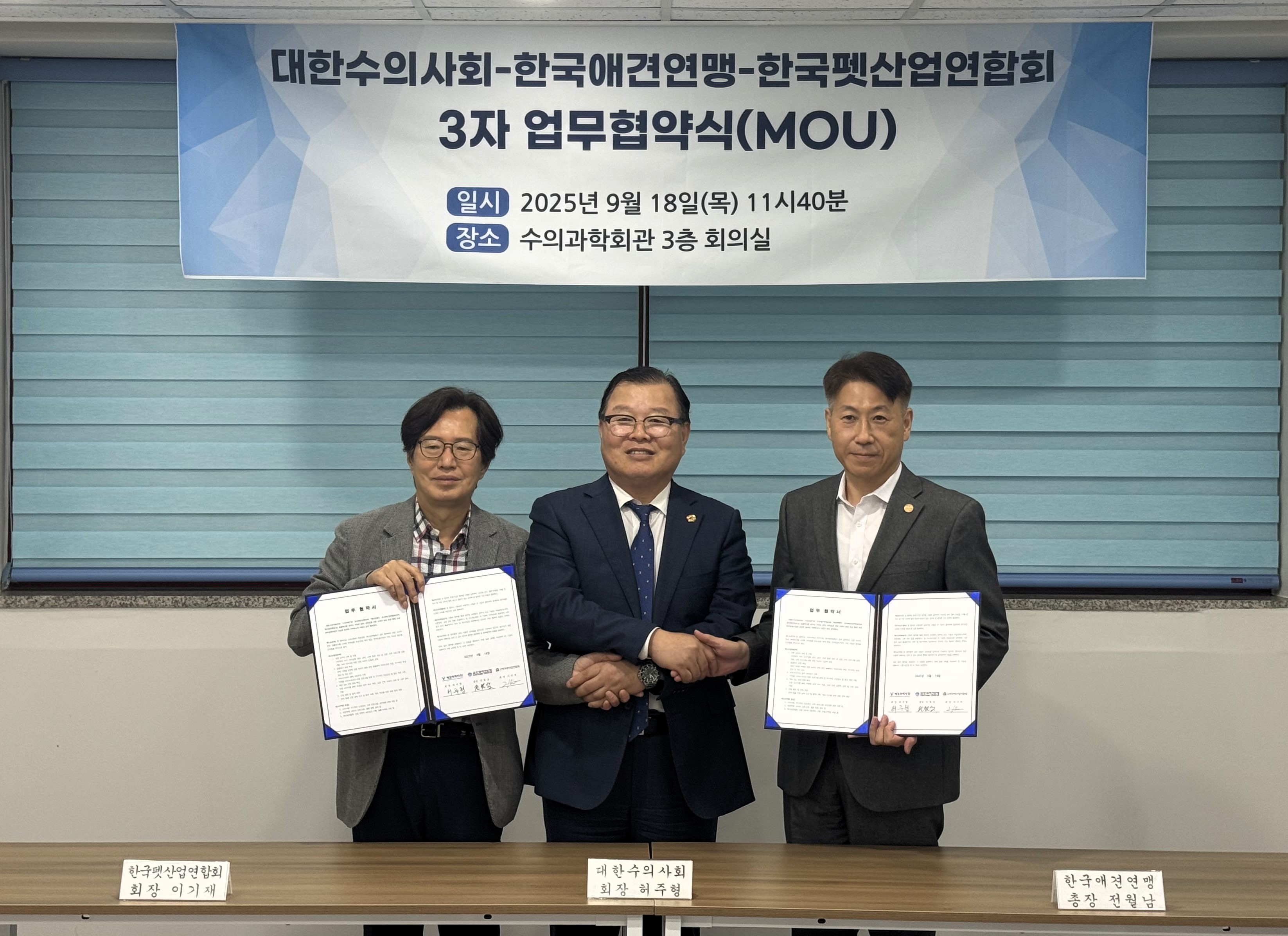 □ 대한수의사회(회장 허주형)는 지난 9월 18일(목), 성남 수의과학회관에서 한국애견연맹(총장 전월남), 한국펫산업연합회(회장 이기재)와 함께 동물복지 증진과 반려동물 브리더 산업의 건전한 발전을 위한 업무 협약을 체결했다. □ 이번 협약은 반려동물 양육 인구의 급격한 증가에 따라 사회적으로 높아진 동물복지 요구에 대응하고, 책임 있는 입양 문화 확산 과 전문 브리더 양성 등 산업 전반의 건강한 생태계를 구축하기 위해 추진되었다. □ 세 기관은 동물복지 표준 확립, 책임 있는 입양 문화 확산 등 다양한 분야에서 협력할 계획이다. □ 이날 협약식에서 허주형 대한수의사회 회장은“책임 있는 반려동물 입양 문화 정착은 동물의 생명과 안전, 나아가 동물복지 수준 향상에 직결되는 중요한 과제”라며,“수의사들의 전문성을 살려 동물의 건강 및 복지를 증진시킬 수 있도록 적극 협력하겠다.”고 밝혔다. □ 전월남 한국애견연맹 총장은“이번 협약을 계기로 혈통 관리 시스템과 브리더 교육이 더욱 체계화될 것으로 기대한다.”며,“애견연맹은 반려동물 문화가 한 단계 더 진보할 수 있도록 최선을 다하겠다.”고 말했다. □ 이기재 한국펫산업연합회 회장은“산업 현장의 목소리를 반영한 정책 제안과 지원을 통해 협약의 실효성을 높이겠다.”며, “반려동물 산업이 국민에게 신뢰받는 건전한 산업으로 발전할 수 있도록 협력하겠다”고 밝혔다.