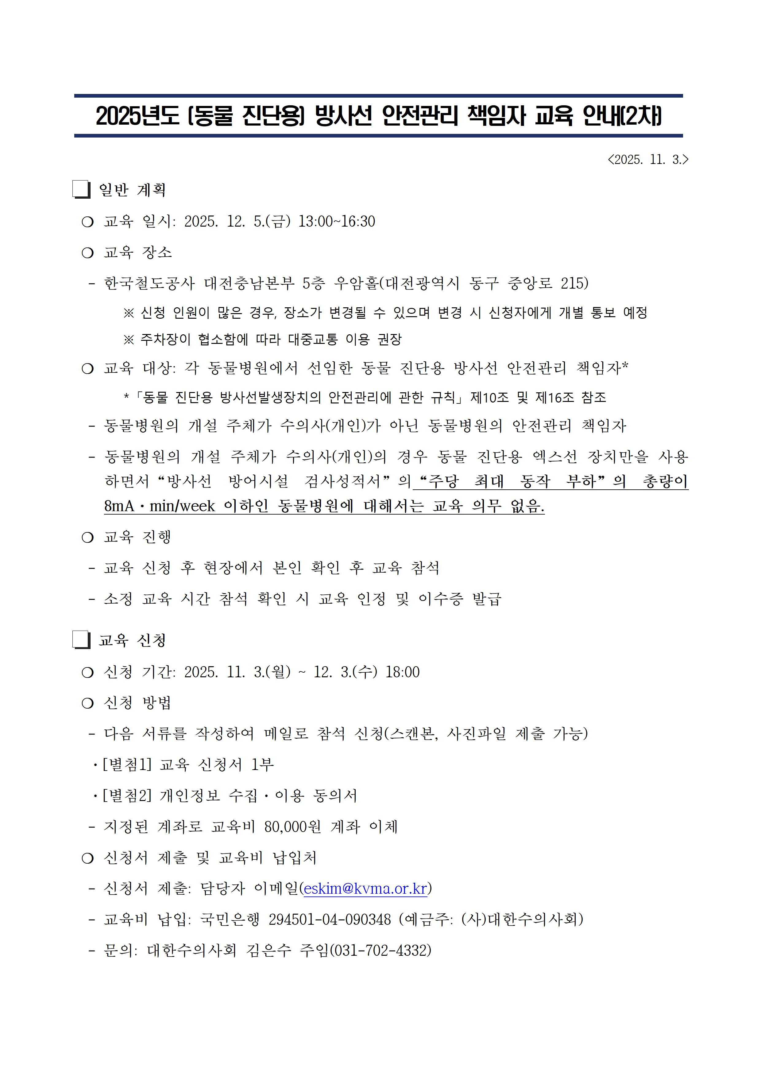 [안내] 2025년도 (동물 진단용) 방사선 안전관리 책임자 교육(2차/12.5.) 안내
