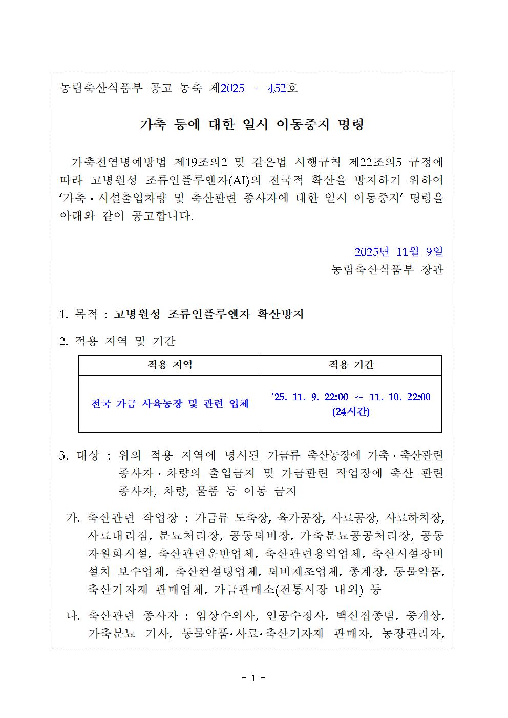 ’25.11.9.(일) 22시부터 11.10.(월) 22시까지(24시간) 전국 가금농장, 작업장, 종사자, 축산차량 등 대상으로 일시 이동중지 시행