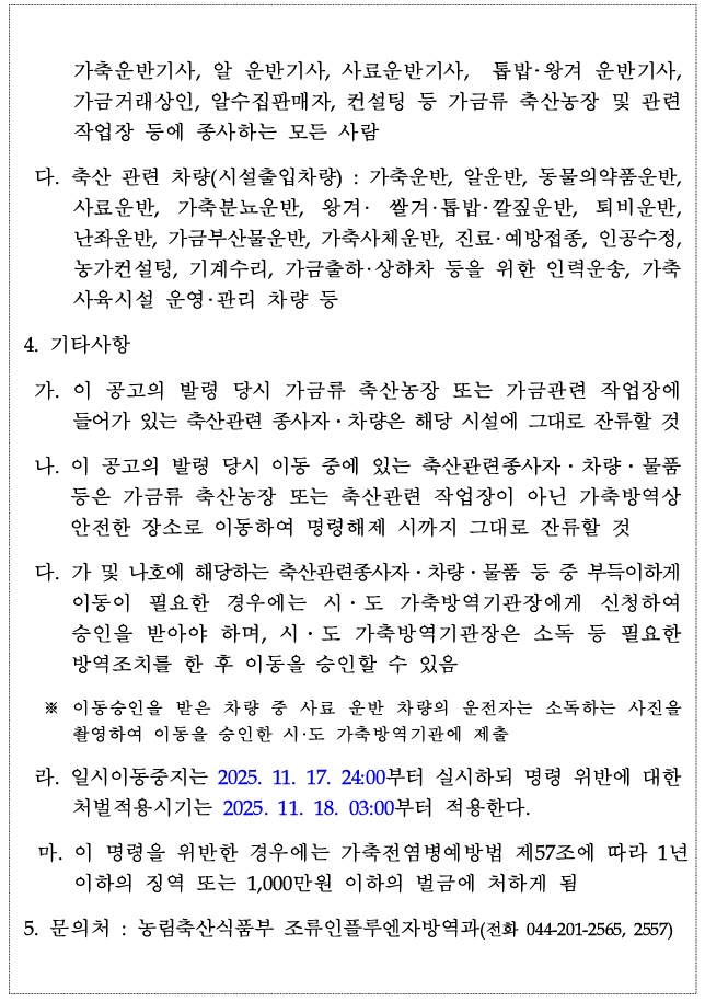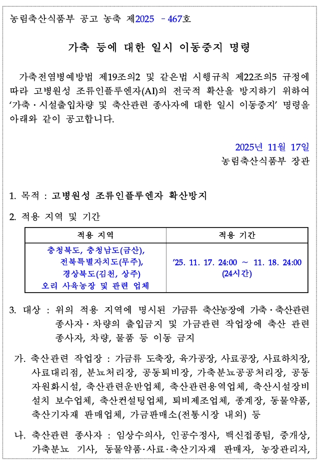 가축(오리) 등의 일시이동중지명령(충청도,전북,경북 등, 25.11.17 24:00~11.18.24:00 /24시간)
