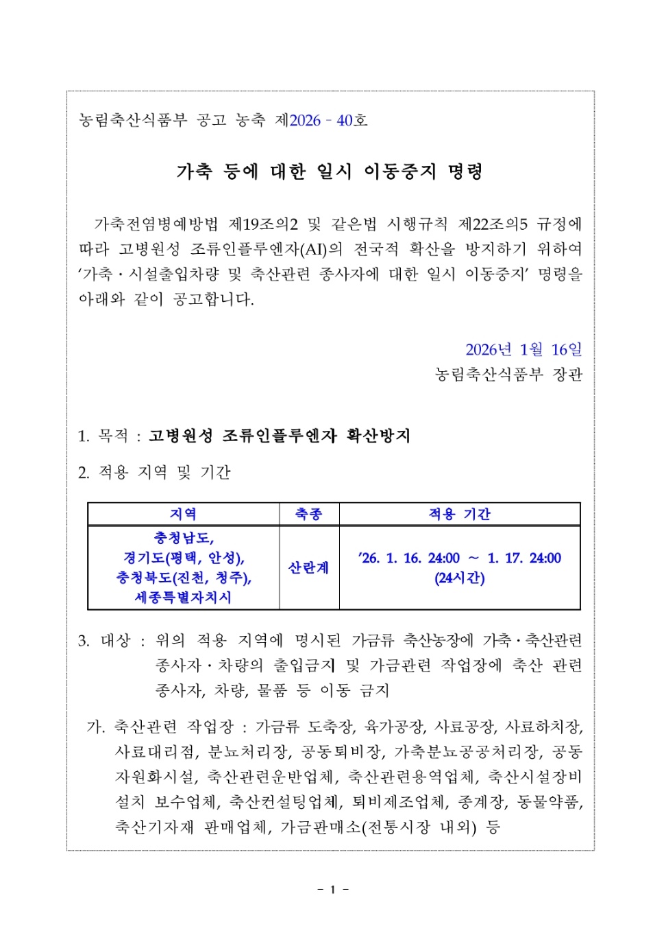 가축(산란계) 등에 대한 일시 이동중지 명령('26.1.16.24:00~1.17.24:00)