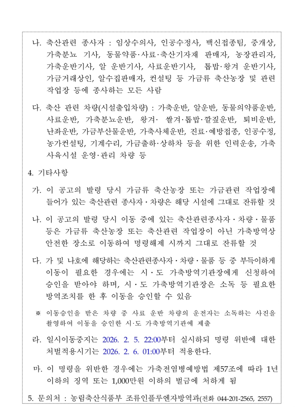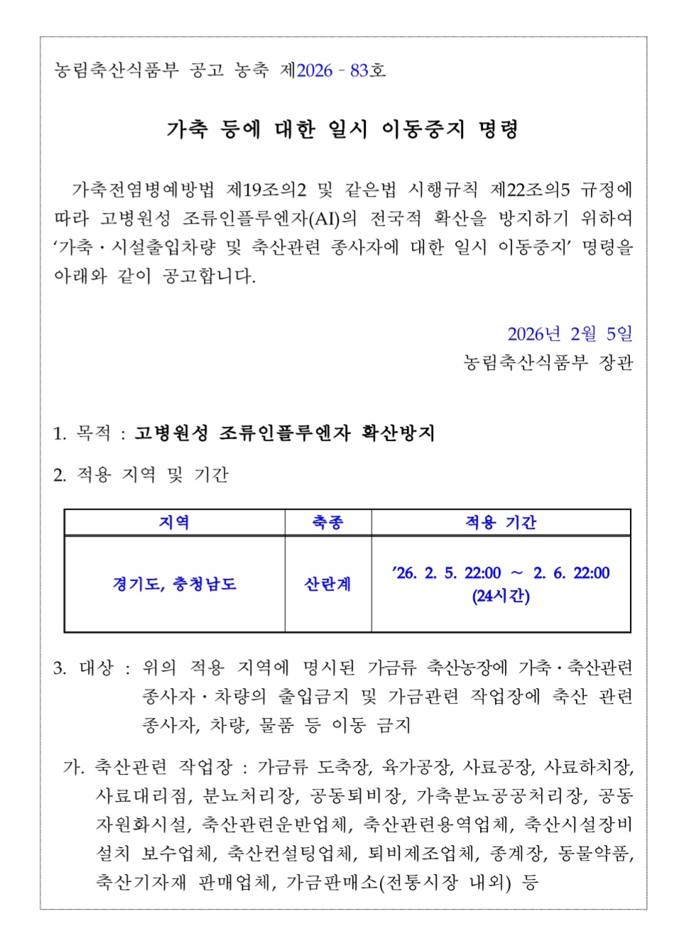 가축(산란계) 등의 일시이동중지명령('26.2.5.22:00~2.6.22:00)