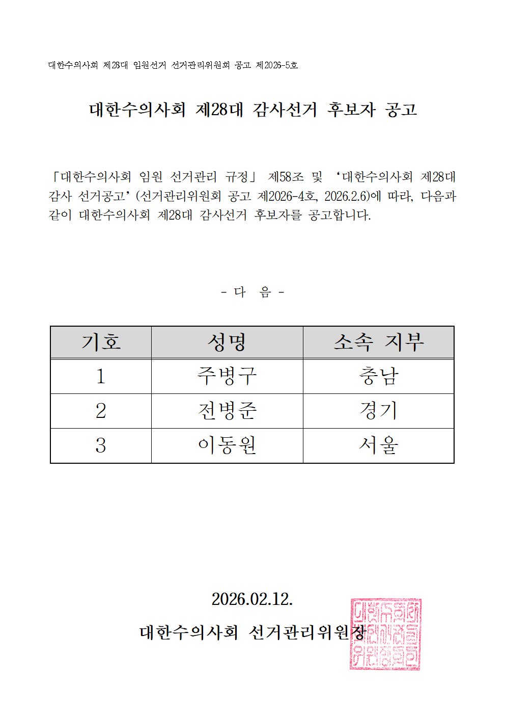 [선거관리위원회 공고 제2026-5] 대한수의사회 제28대 감사 후보자 공고 작성자 대한수의사회 이메일 shkim@kvma.or.kr 등록일 2026-02-12 조회수 32 첨부파일 링크
