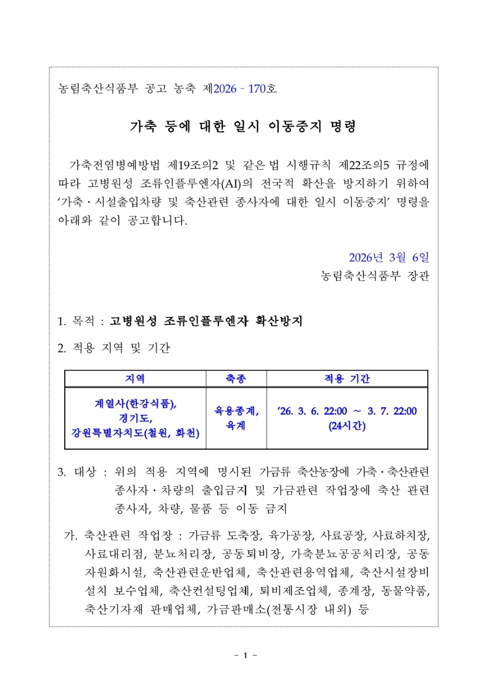 가축(육용종계,육계) 등에 대한 일시 이동중지('26.3.6.22:00 ~ 3.7.22:00)