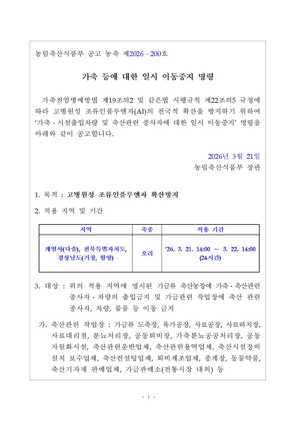 가축(오리) 등에 대한 일시 이동중지 명령('26.3.21.14:00~3.22.14:00) 작성자 대한수의사회 이메일 kvma86@kvma.or.kr 등록일 2026-03-21 조회수 17 첨부파일 오리001.jpg 오리002.jpg 링크
