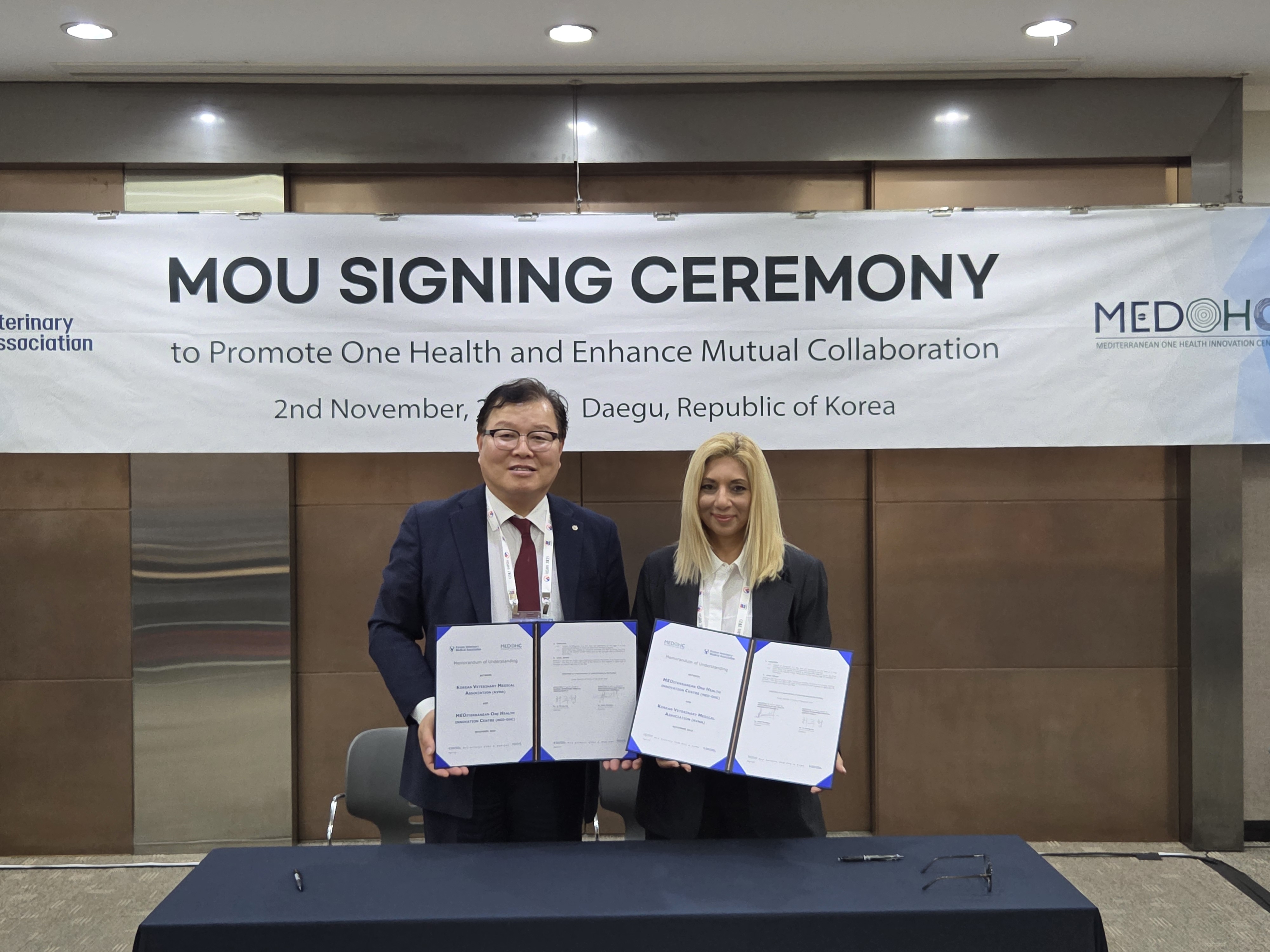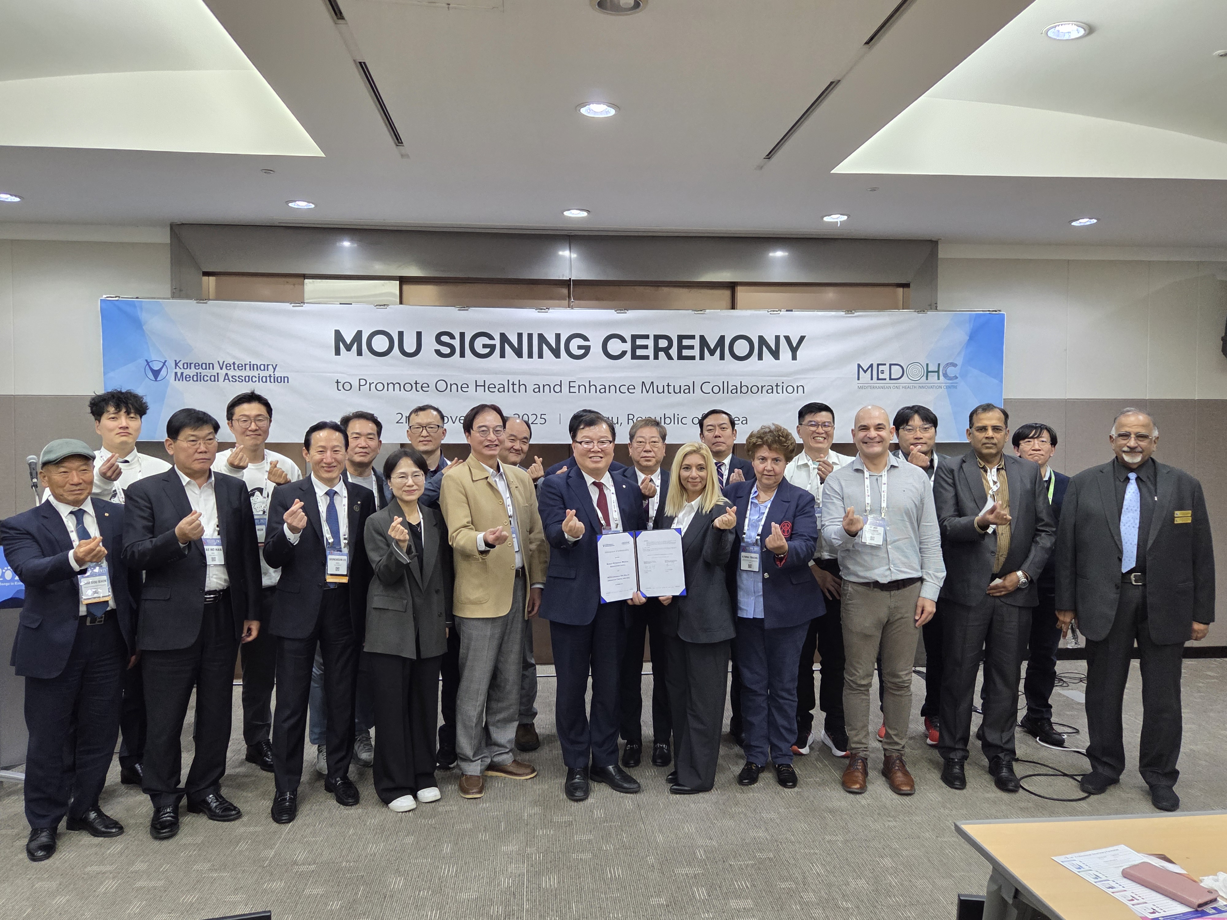 □ 대한수의사회(회장 허주형)는 11월 2일 대구 EXCO에서 그리스의 지중해원헬스혁신센터(회장 Eleni Pavlidou, Mediterranean One Health Innovation Centre, 이하 MED-OHC)와 원헬스* 증진을 위한 교육, 정보 교유 등 국제 협력 강화를 위한 업무협약(MOU)을 체결했다. * 사람, 동물 및 생태계의 건강을 지속 가능하고, 균형 있게 맞추며 최적화하는 것을 목표로 하는 통합된 접근 방식 □ MED-OHC는 지중해 지역의 원헬스 문제를 해결하기 위해 그리스를 기반으로 설립된 민관협력 비영리 단체이다. 유럽·아시아·아프리카 3개 대륙이 만나는 그리스의 지정학적 위치를 바탕으로 전 세계의 동물 질병, 신종 감염병, 항생제 내성 문제뿐만 아니라 기후 변화, 식량 안보 등 폭넓은 분야를 다루고 있다. □ MED-OHC 대표단은 10월 31일부터 11월 2일까지 대구 EXCO에서 개최된 아시아 반려동물 수의사들의 국제 학회인 제13차 아시아·태평양소동물수의사대회(FASAVA Congress 2025)에 참석하여 우리나라를 비롯한 아시아 수의계 현황 및 원헬스 활동 등을 살펴봤다. □ 행사 마지막 날인 11월 2일 진행된 업무협약식에는 대한수의사회 집행부와 MED-OHC 대표단을 비롯해 FASAVA 관계자 등 해외 수의사들도 참석해 양 기관의 목표를 공유하고 향후 협력 강화를 함께 다짐했다. □ 양 기관은 이번 협약을 통해 원헬스의 관점에서 동물 질병, 수의학 교육, 동물복지, 의약품 관리, 항생제 내성, 식량 안보 및 식품 안전 등 다양한 분야의 문제 해결을 위해 협력을 강화하기로 했다. 이를 위해 교육 분야 협력과 정보 교류 활성화 등 구체적 협력 사업을 추진할 예정이다. □ 허주형 회장은 “원헬스의 정신은 직업, 기관, 국가를 넘어선 협력을 요구한다”며, “이번 협력은 수의계뿐만 아니라 사회 전체의 건강과 행복 증진을 위한 중요한 계기가 될 것”이라고 강조했다. □ Eleni Pavlidou 회장은 “이번 협약은 그리스와 한국, 유럽과 아시아 간 교류를 위한 첫 걸음이며, 실질적인 협력이 이루어질 수 있도록 적극적으로 노력하겠다”고 말했다.
