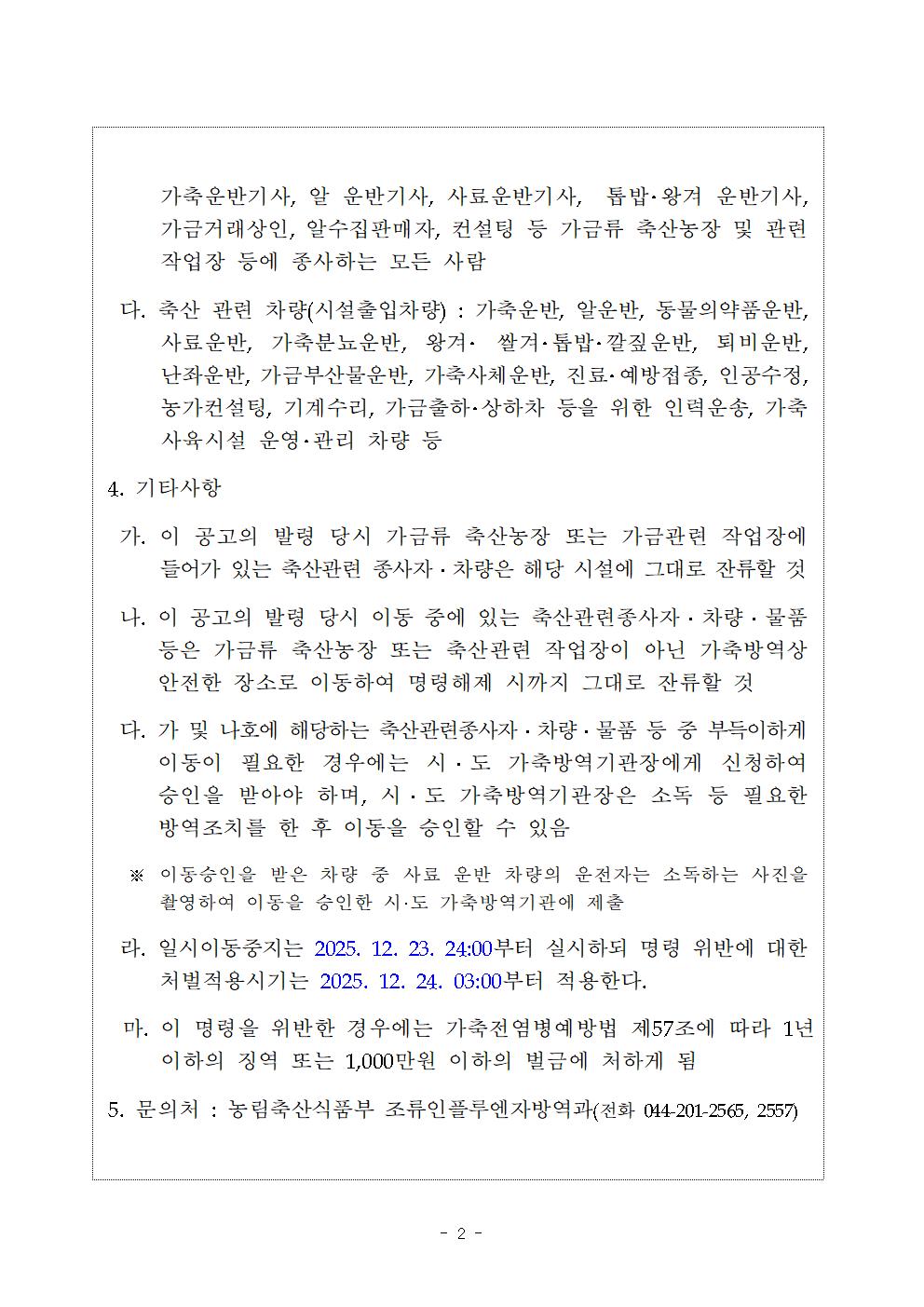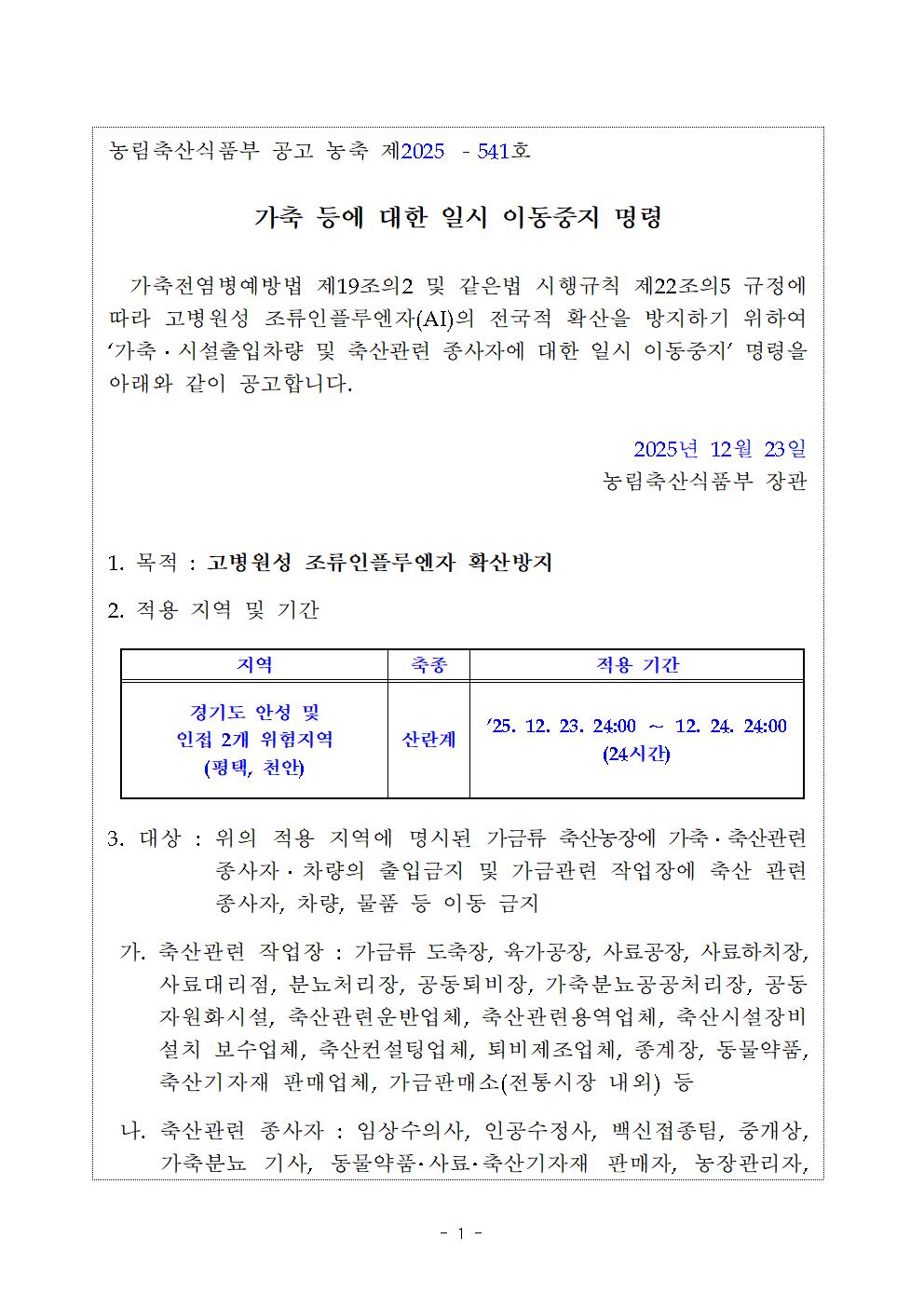 가축(산란계) 등의 일시이동중지명령(12.23.24:00~12.24.24:00)