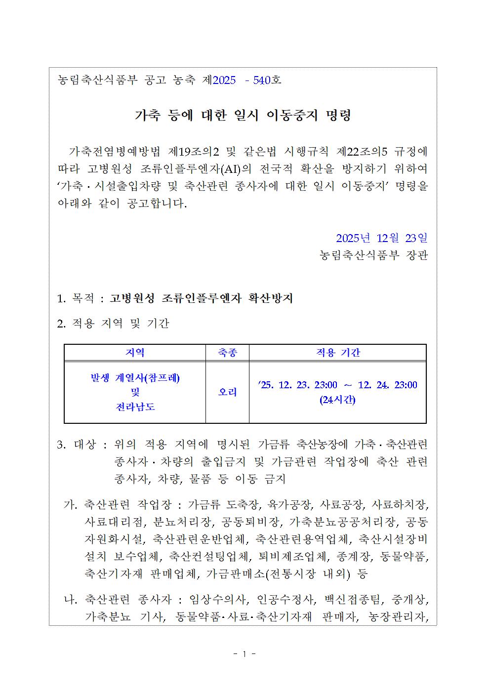 가축(오리) 등의 일시이동중지명령(12.23.23:00~12.24.23:00)
