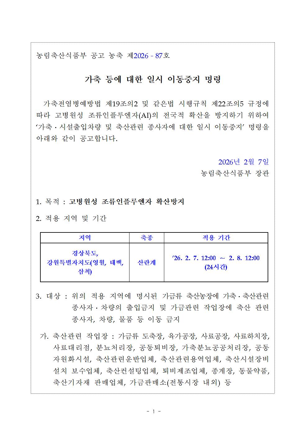가축(산란계) 등의 일시이동중지명령('26.2.7.12:00~2.8.12:00)