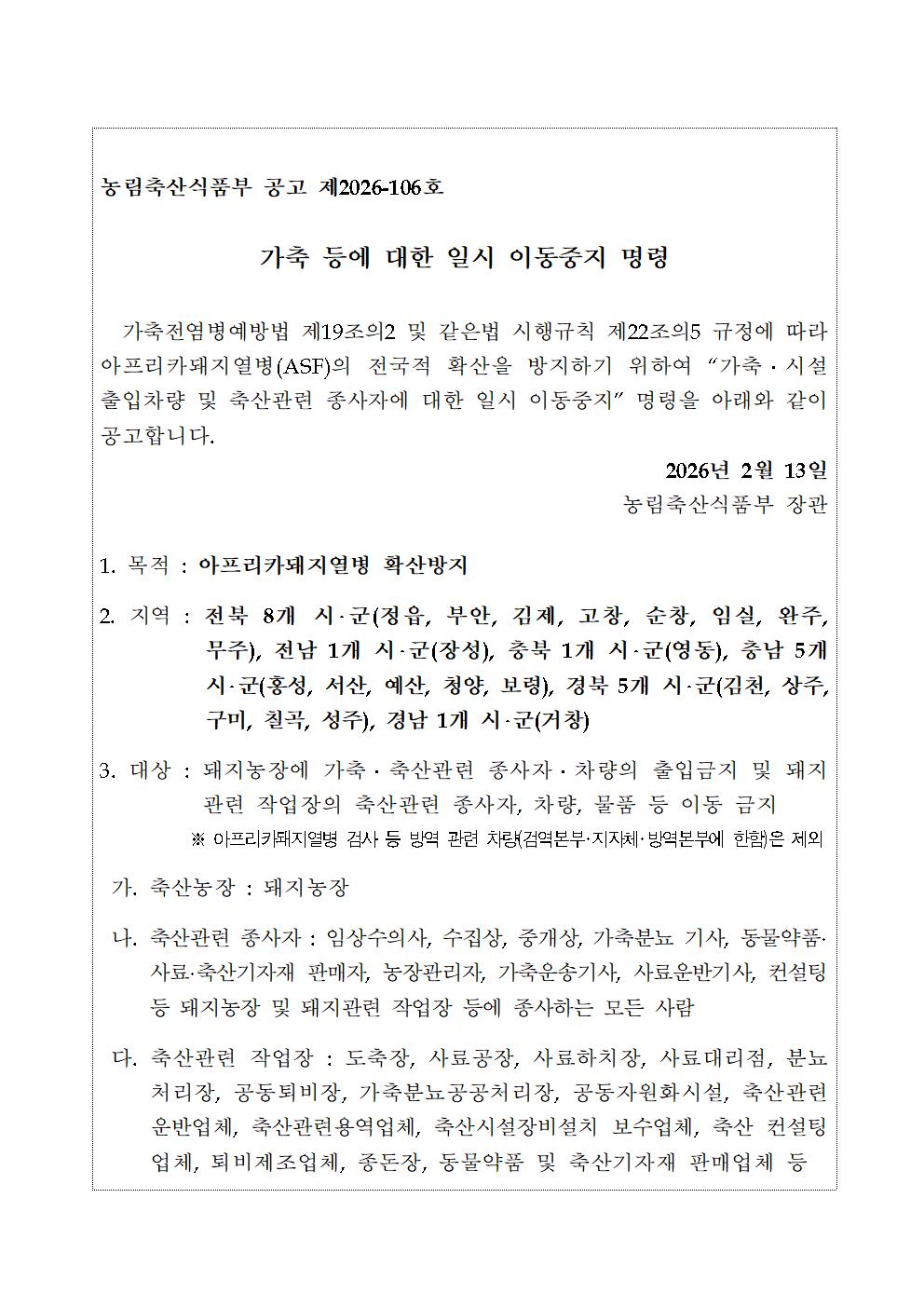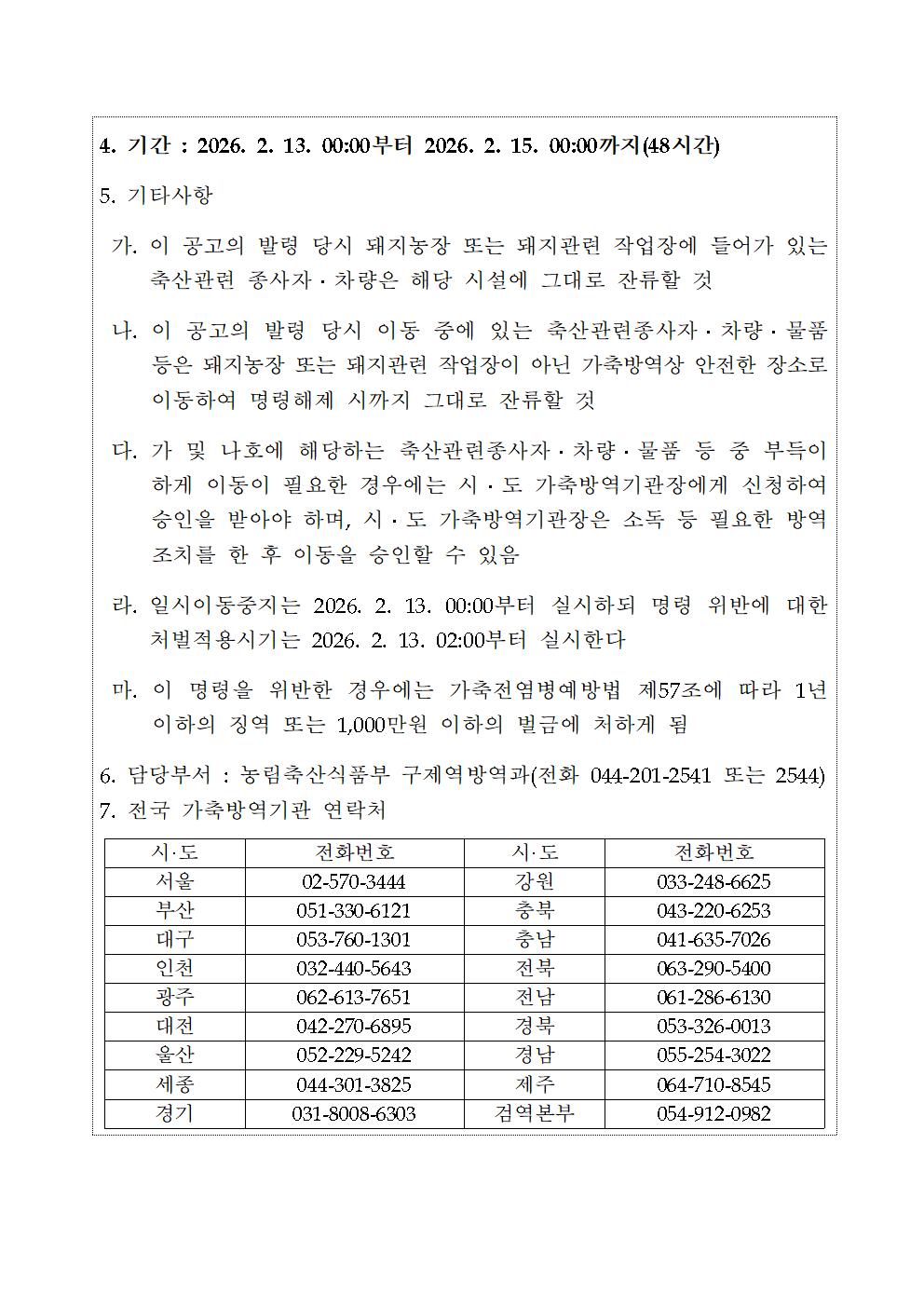 가축(돼지) 등에 대한 일시 이동중지 명령(2.13.00:00~2.15.00:00)