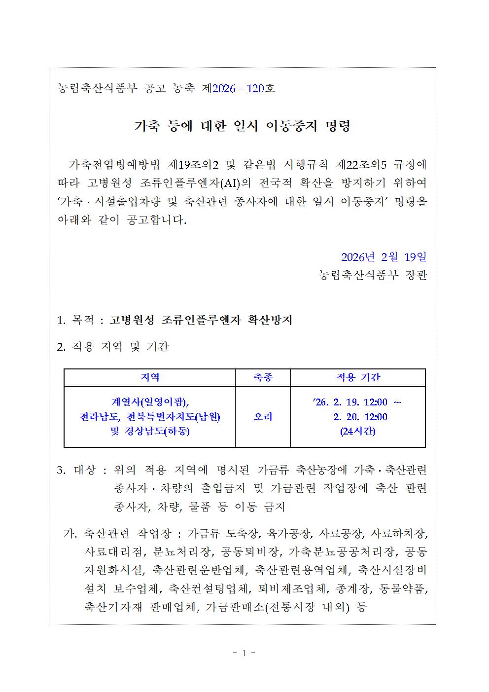 가축(오리) 등에 대한 일시 이동중지 명령('26.2.19.12:00~20.12:00)