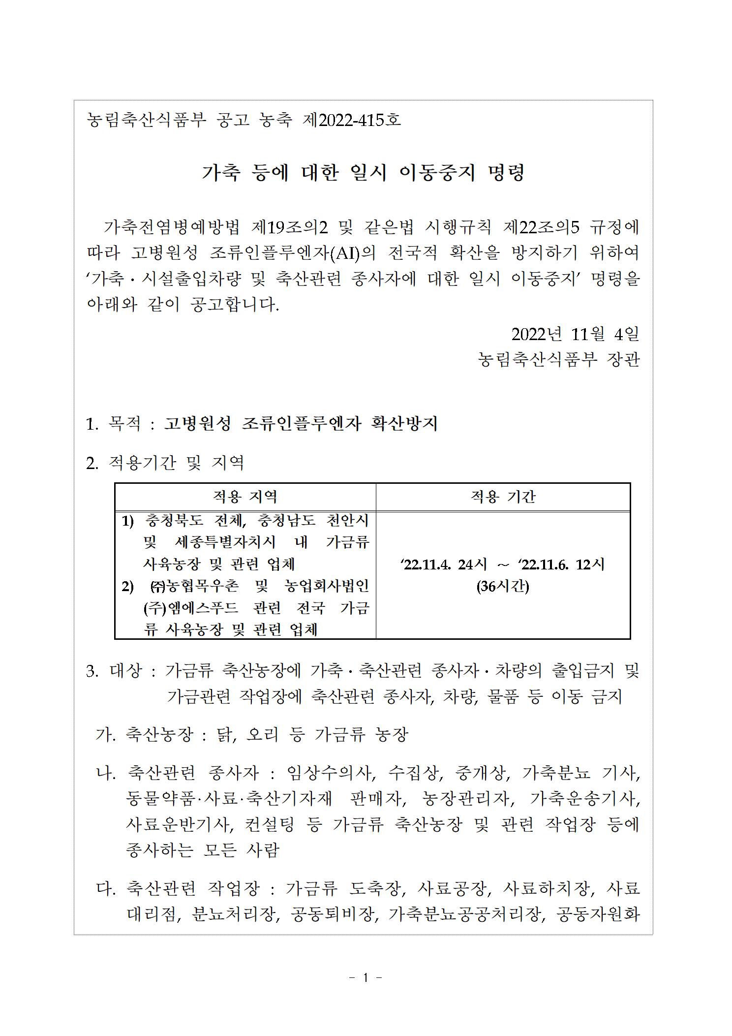 가축(돼지) 등에 대한 일시 이동중지(무안 등) 명령('26.2.20.19:00~2.21.19:00) 작성자 대한수의사회 이메일 kvma86@kvma.or.kr 등록일 2026-02-20 조회수 16 첨부파일 4001.jpg 4002.jpg 링크