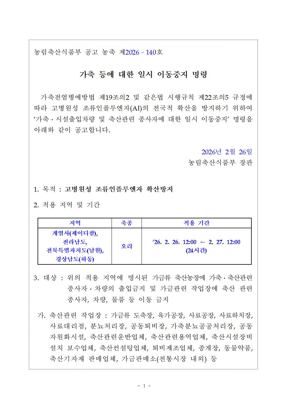 가축(오리) 등에 대한 일시 이동중지 명령('26.2.26.12:00 ~ 2.27.12:00) 작성자 대한수의사회 이메일 kvma86@kvma.or.kr 등록일 2026-02-26 조회수 31 첨부파일 27001.jpg 27002.jpg 링크