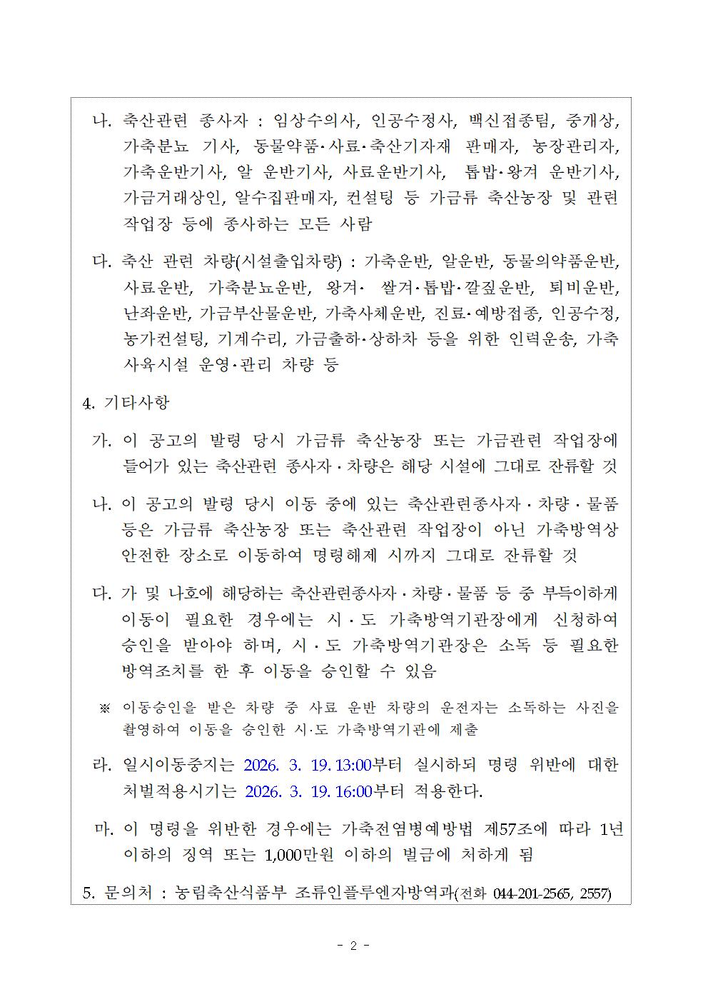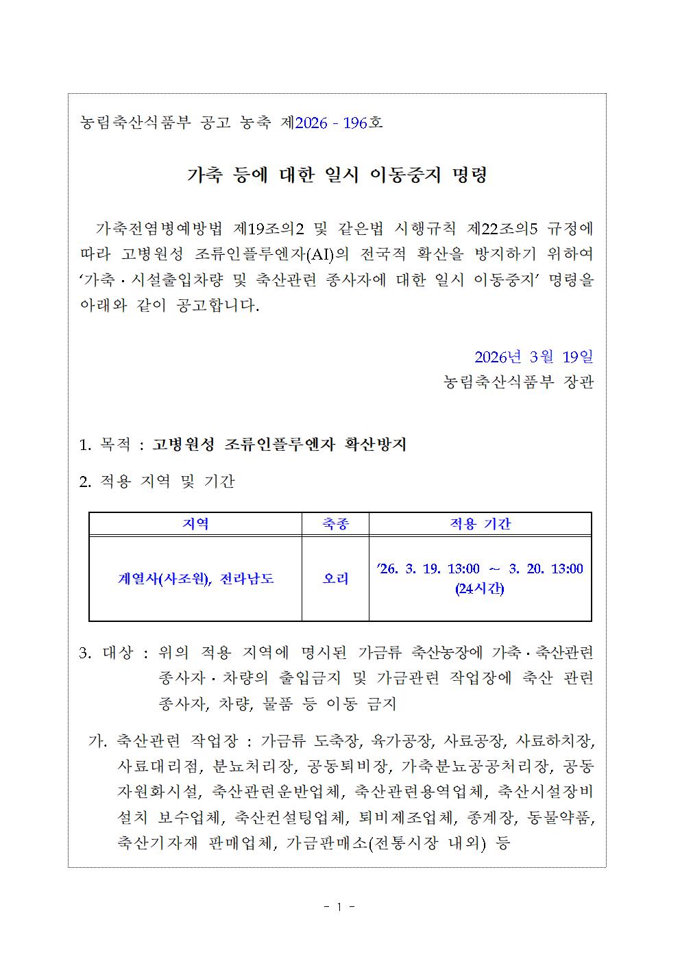 가축(오리) 등에 대한 일시 이동중지 명령('26.3.19.13:00~20.13:00)